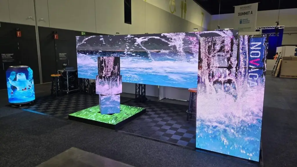 It was another huge show and we put on a brilliant display across a 21sq meter space. But this time we setup a gorgeous digital LED floor as well as the 3 x staggered and stacked LED cubes. Another great feature was our large 6m back wall with multisport video input across the LED screen and also had a gorgeous 90degree 2m high transparent LED display. All media players were setup together, meaning we had an asynchronous control system which was broadcast a mini LAN network and played in sync with each other. We pushed a gorgeous and spectacular waterfall video which was a real treat with guests.